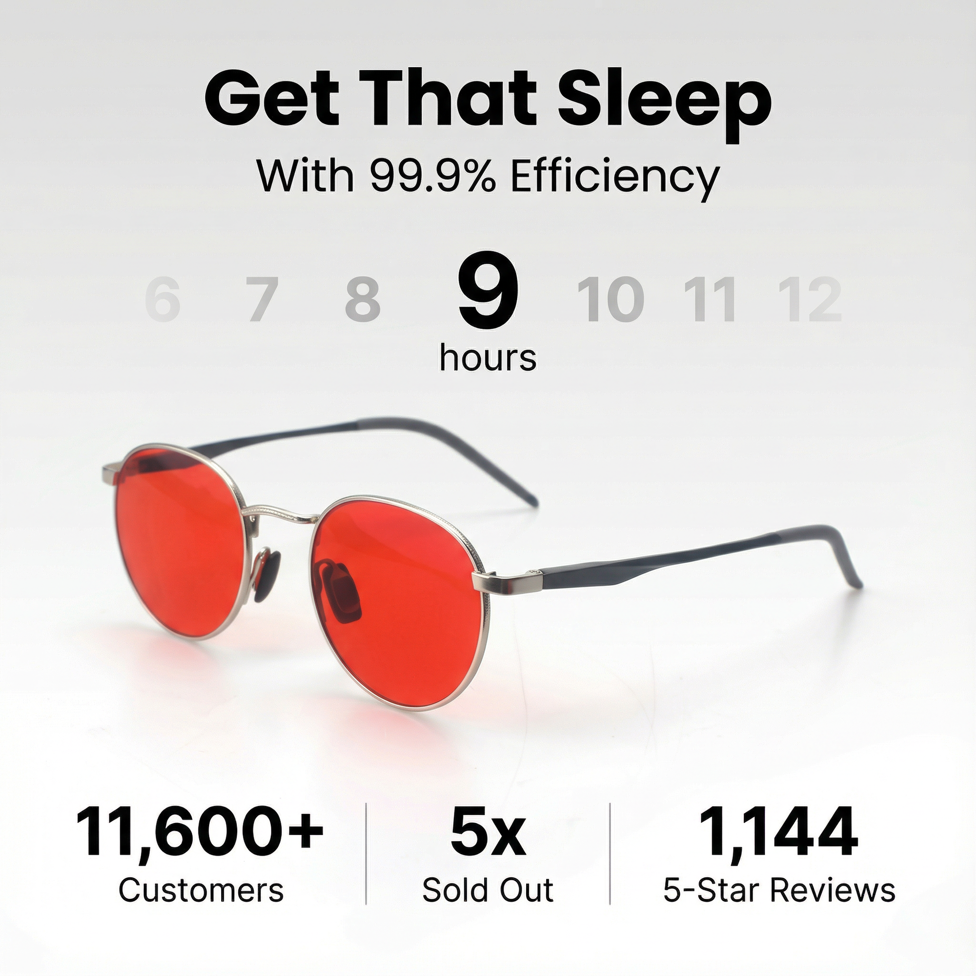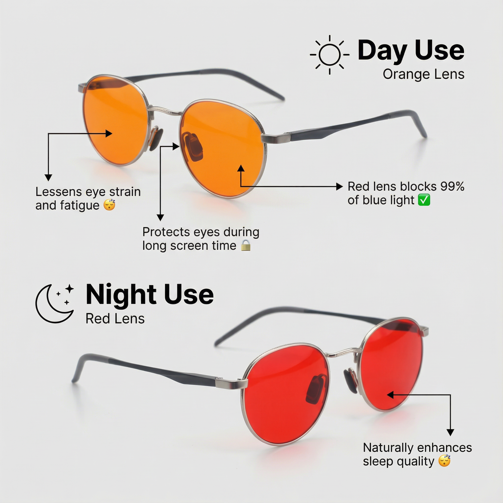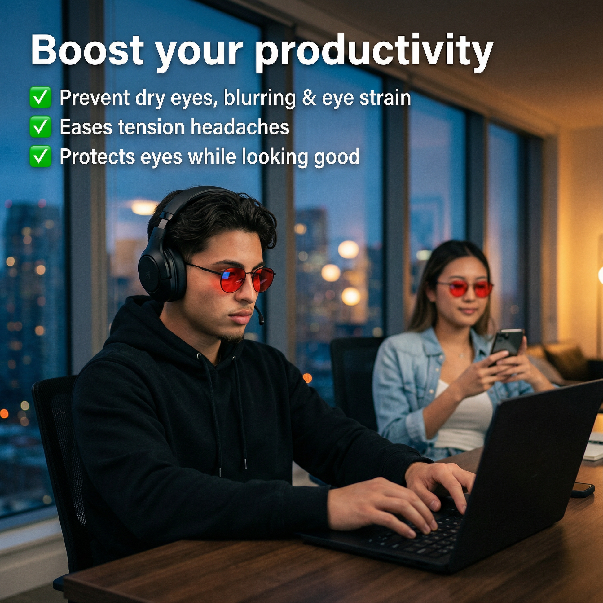 Red lenses block harsh blue light — easing eye strain, improving sleep, and boosting your energy.